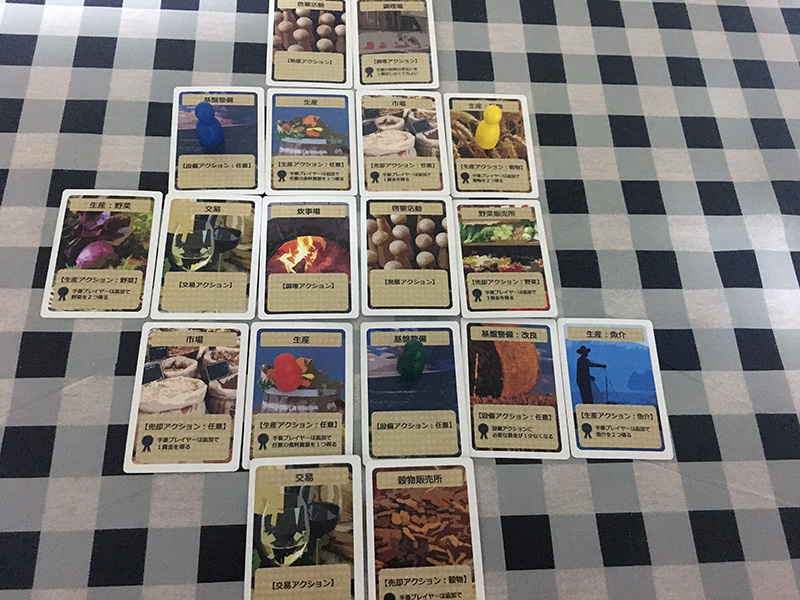 提升設備、生產資源、販賣資源、交易、調理、發展等幾種,隨著遊戲進行,可以使用的行動卡會越來越多。